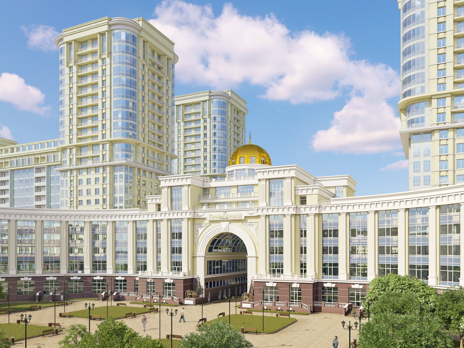 Неповторимый шарм проекту придают огромные панорамные окна и величественная входная арка, украшенная строгими колоннами и большим куполом.