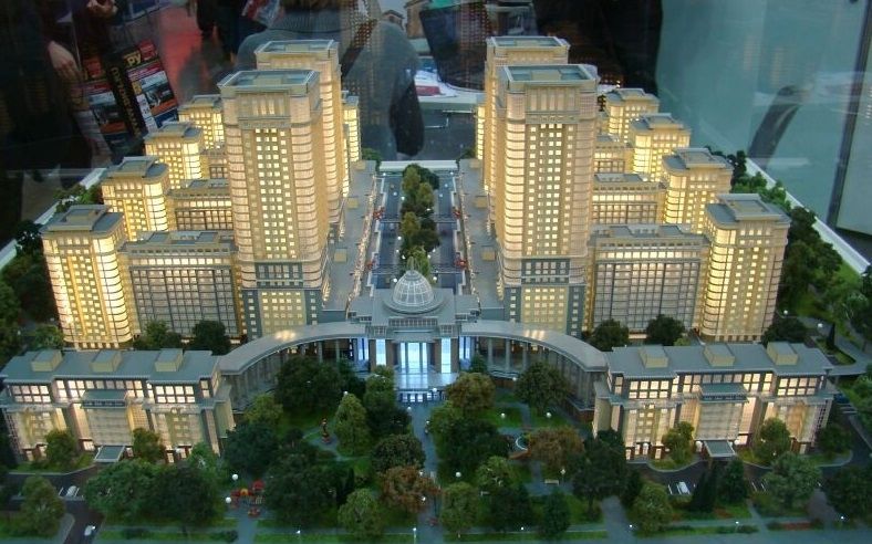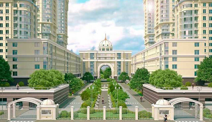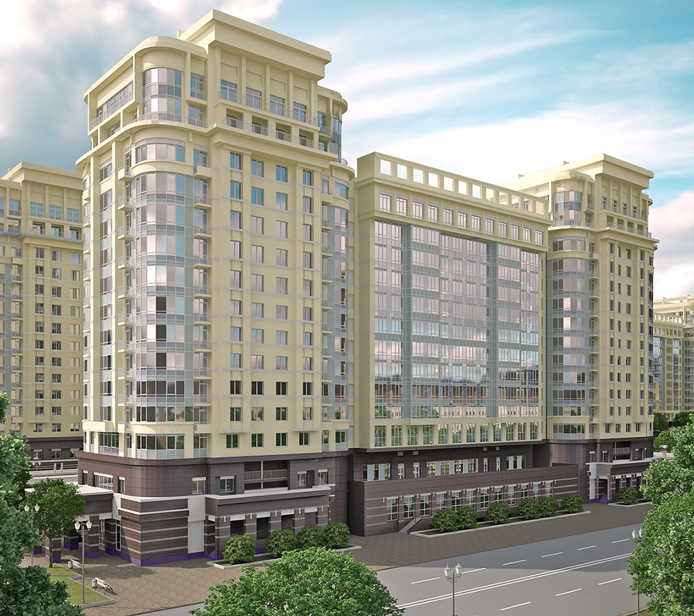 Роскошные фасады домов, выдержанные в духе классицизма, дополнены изящным декором. Вдохновением служили дома в стиле Сталинского ампира.